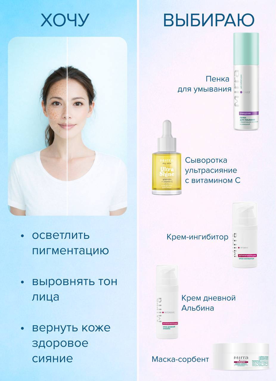 Ваша кожа заслуживает быть ровной, сияющей и ухоженной. С программой против пигментации от MIRRA это просто!